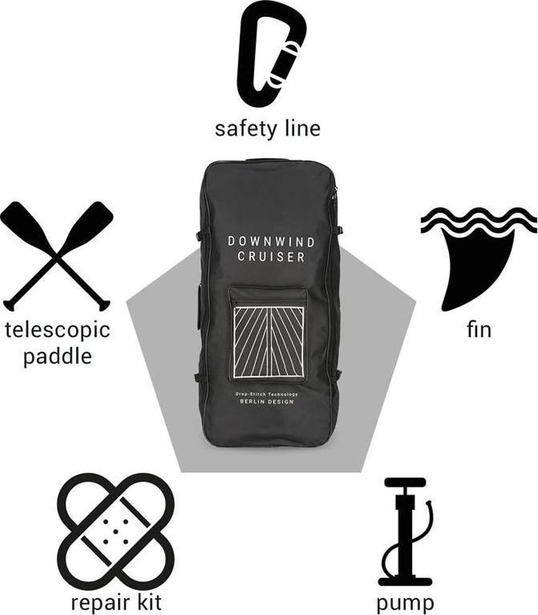 Met de hogedrukpomp heb je in een paar minuten de PVC-hogedruk kamers van het SUP board gevuld. Daarbij garandeert de bijzonder robuuste buitenkant in DoubleLayer Technology een zeer hoge stevigheid van het board: in plaats van normaal gesproken één, vormen hier meteen twee lagen van pvc de buitenkant. De binnenkant van het board is in DropStitch Technology vervaardigd: de loodrechte pvc-vezels houden het board in vorm en zorgen onder hoge druk voor een extreem hoge kwaliteit. Net zo snel als hij is opgepompt is de Downwind Cruiser 9.8 weer in een 55 liter transportrugzak opgeborgen. Hij past in iedere kofferbak en kan dankzij het geringe totaalgewicht de set van slechts 12,3 kg ook gemakkelijk over lange afstanden worden gedragen.