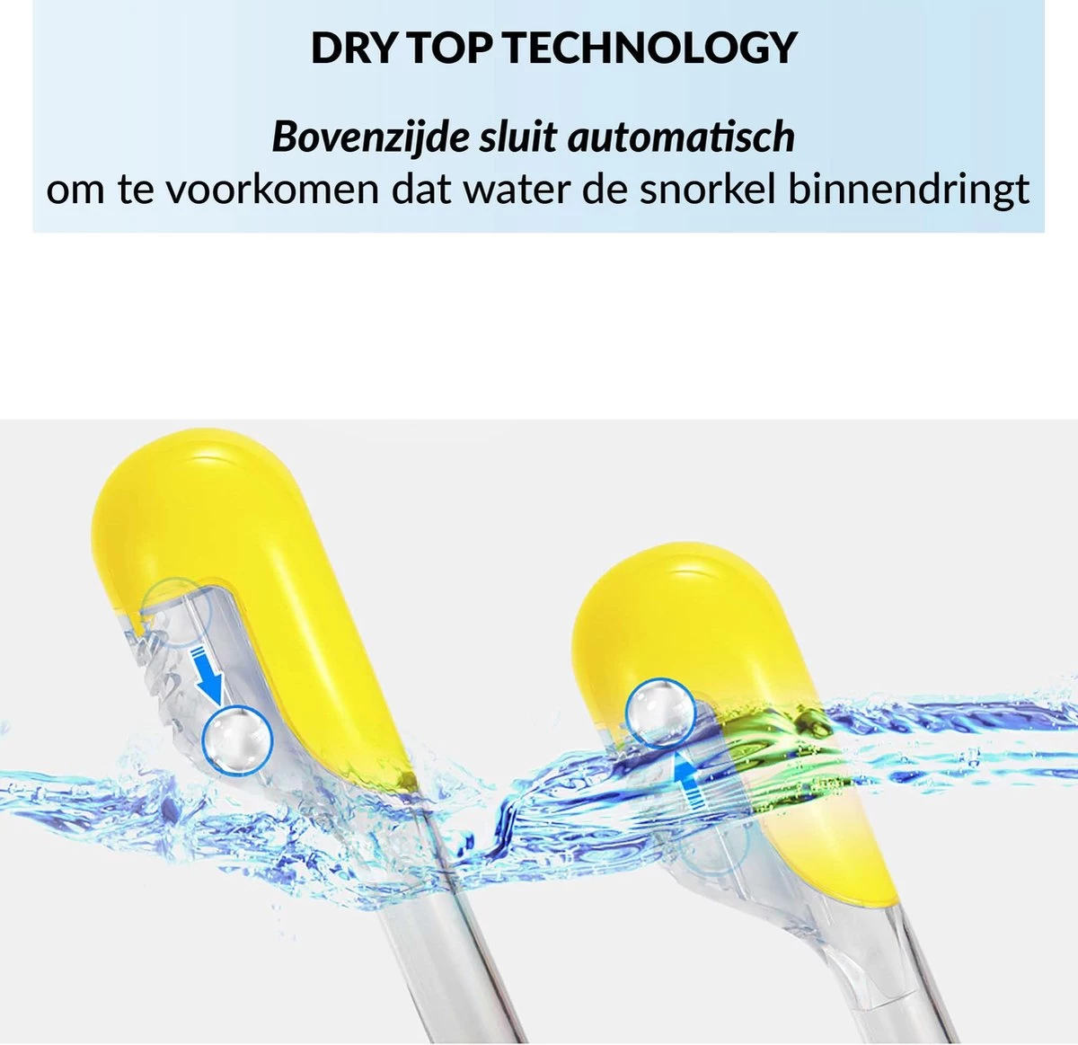 • Het ventiel op de snorkel sluit automatisch zodat je geen water binnen krijgt.