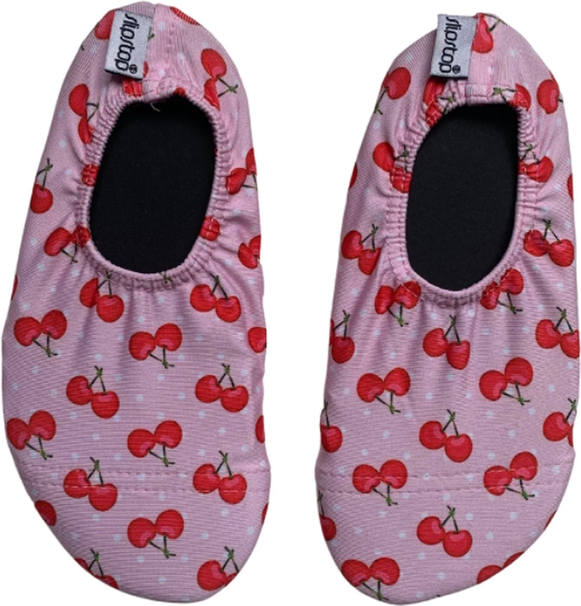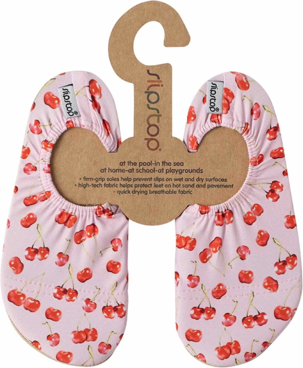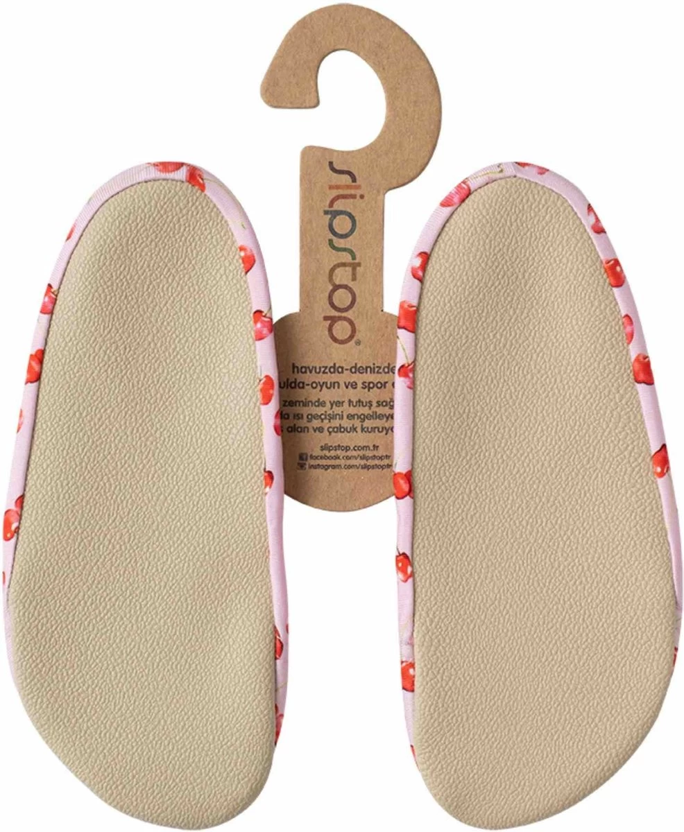 Slipstop shoes roze met kersjes zijn fijne zwemschoentjes die licht van gewicht zijn en goed aanblijven middels het elastiek rondom de enkel. Met de fantastische (dunne) antislipzool,