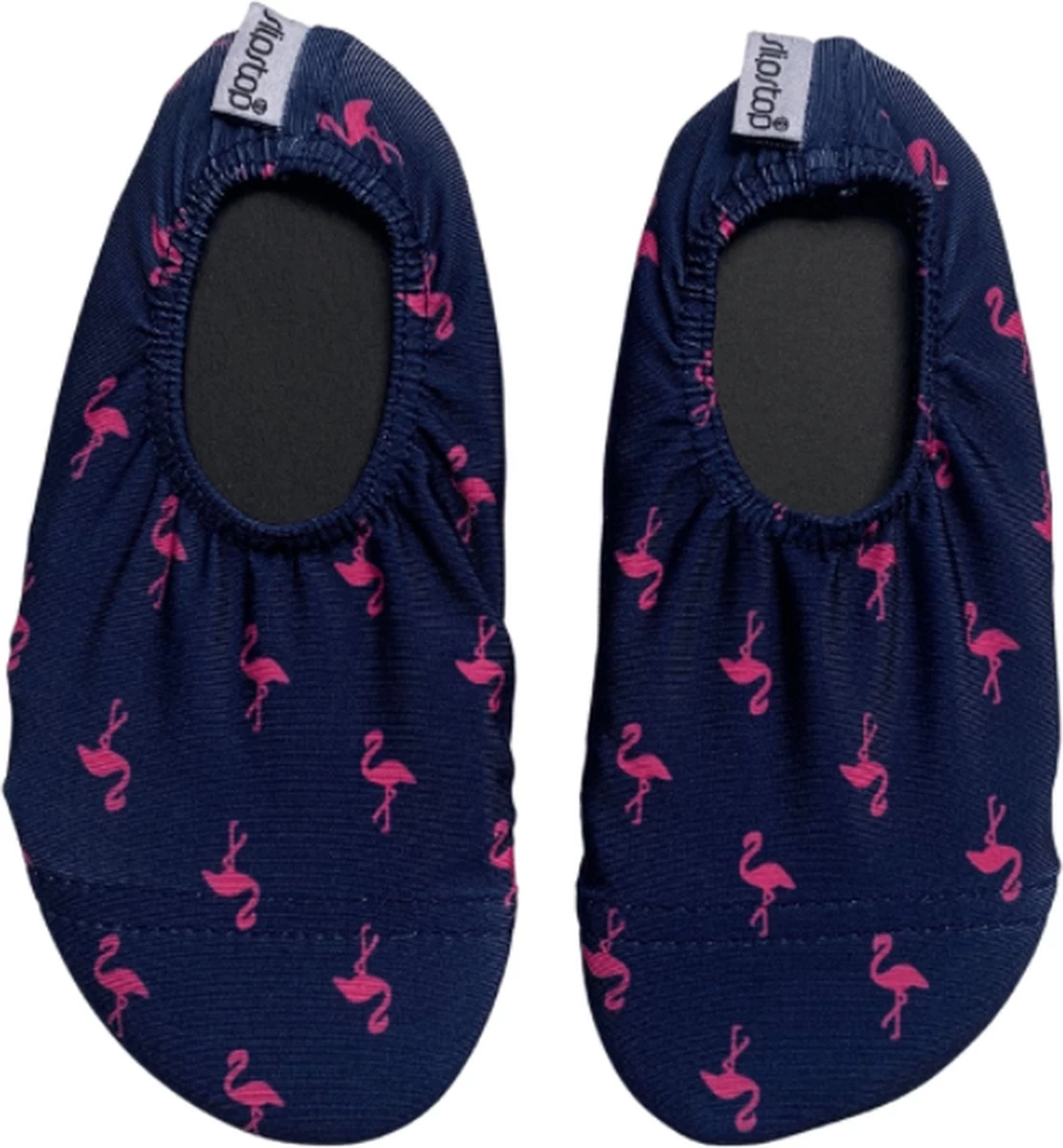 Slipstop Ella – Blauwe waterschoentjes met roze flamingo’s, schattige voor meisjes Donker blauwe zwemschoentjes met subtiele roze flamingo’s! Deze schattige donker blauwe slipstopsshoes kunnen goed onder elke badpakje of bikini.