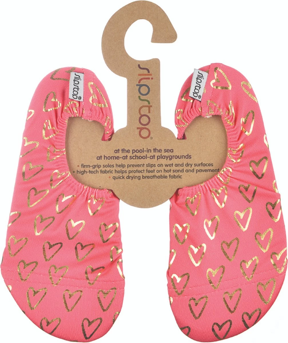 Slipstop Lily- Fuchsia roze waterschoenen voor meisjes met goude hartjes Ben jij bang dat je kindje uitglijdt op de gladde zwembad vloer? Of bang dat hij of zij haar voeten brand aan de hete tegels of hete zand op het strand? Klaagt je kindje over het prikken van gras, steentjes of takjes onder de blote voeten? Dat is verleden tijd met de Slipstop slofjes. Waarvoor gebruik je Slipstop?Deze waterschoenen voor meisjes zijn niet alleen waterschoentjes. Je kan Slipstop namelijk ook perfect gebruiken voor naar het strand of de speeltuin. Want slipstopshoes zorgen ervoor dat de steentjes, schelpjes en takjes niet in de voetjes prikken. En Slipstop houdt de warmte van opgewarmd zand tegels of