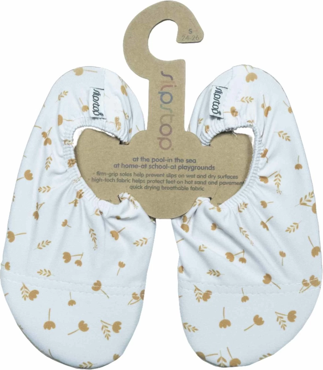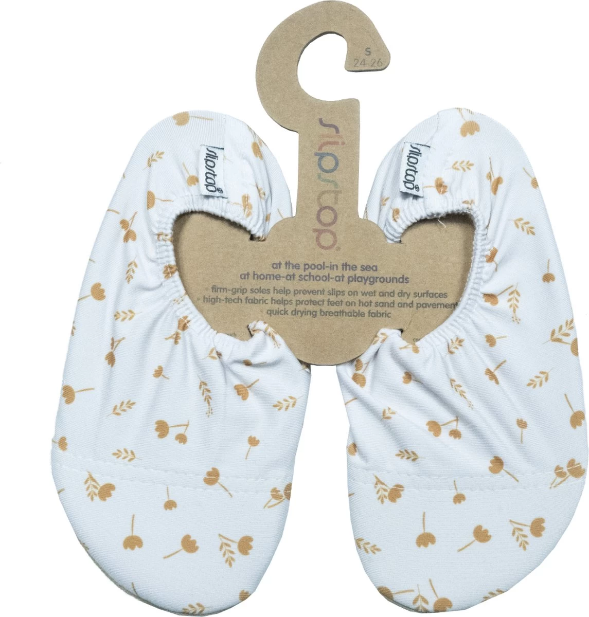 Slipstop Mosterd Grain – Wit met oker bloemen, schattige voor meisjes Oker kleurige bloementjes op witte zwemschoentjes! Deze schattige en hippe kleur slipstopsshoes kunnen goed onder de zwem outfitjes van dit seizoen.