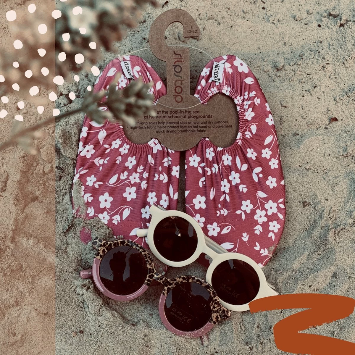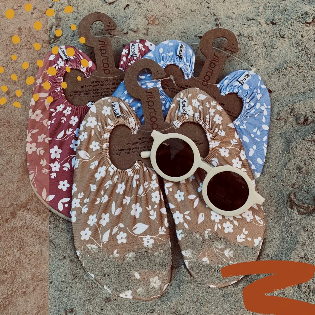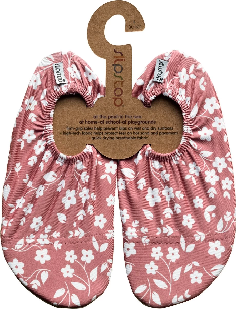 Slipstop Stone Flower – Roest bruin met witte bloemen, enig voor meisjes Roest bruin/rood kleurige zwemschoentjes met een wit schattig bloemen printje! Deze hippe kleur slipstopsshoes kunnen goed onder de zwem outfitjes van dit seizoen.